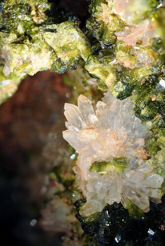 モロッコよりお越しの緑簾石と水晶です。 写っている範囲は5mmほどと小さいものですが、洞窟の中にひっそり生える水晶。という体でなかなか気に入っていたり。 こんな感じで誰も知らない場所の誰もしらないスキマにこっそり奥ゆかしく育った石ども。 これが…